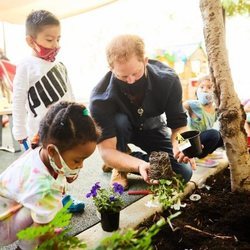 El Príncipe Harry plantando flores en Preschool Learning Center de Los Angeles