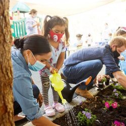 El Príncipe Harry y Meghan Markle plantando flores en Preschool Learning Center de Los Angeles