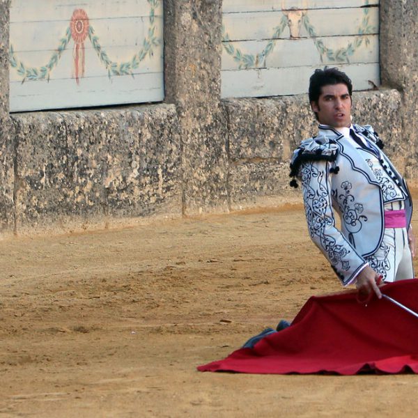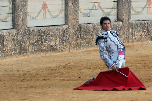 El torero Cayetano Rivera recibiendo de rodillas a uno de sus toros durante la Goyesca que cada año se celebra en Ronda