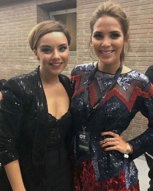 La cantante Chenoa y la actriz venezolana Rosanna Zanetti, dos de los amores de David Bisbal, se realizan una foto durante el concierto 'OT: el reencuentro'