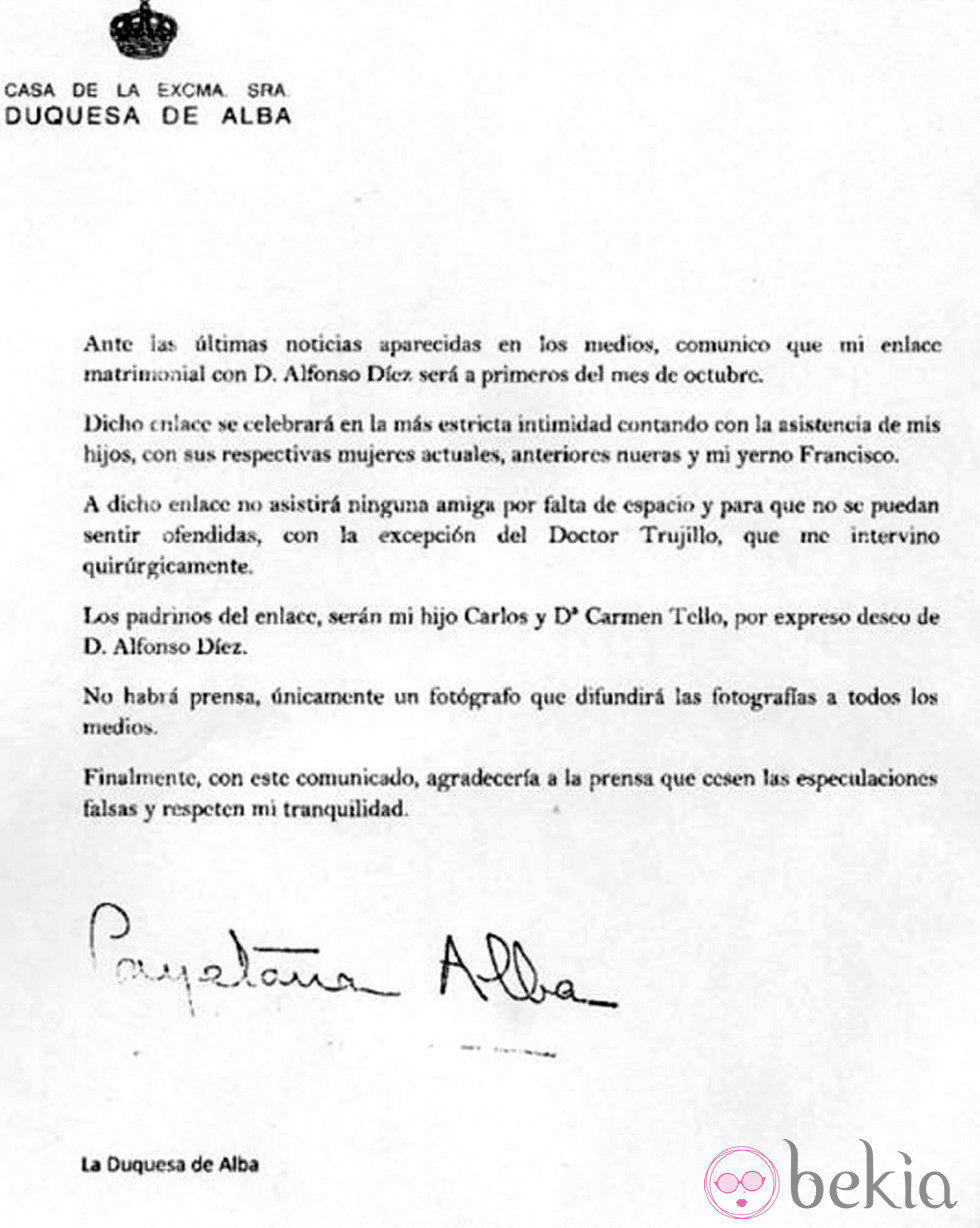 Reproducción del comunicado en el que la Duquesa de Alba anuncia su boda con Alfonso Díez.