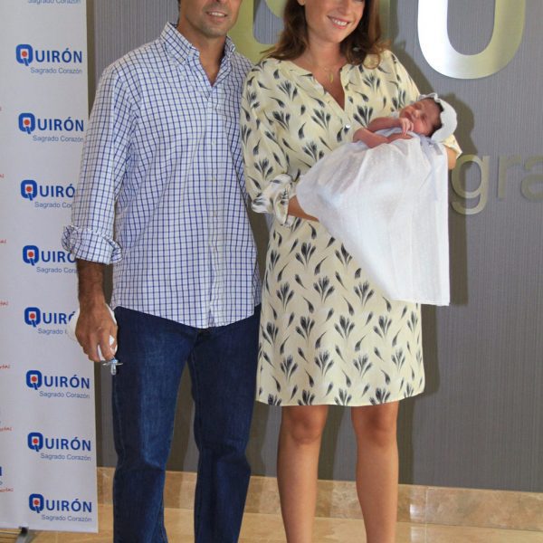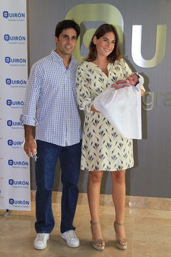 El torero Fran Rivera y su mujer Lourdes Montes presentan a su hija Carmen a la salida del hospital en Sevilla.
