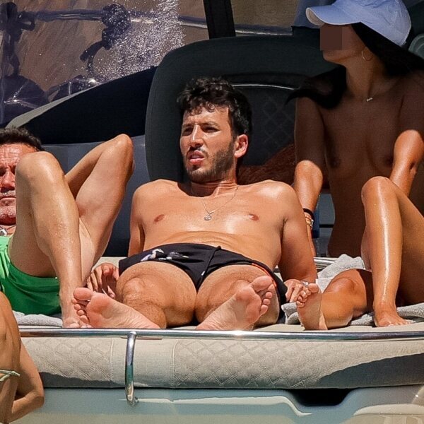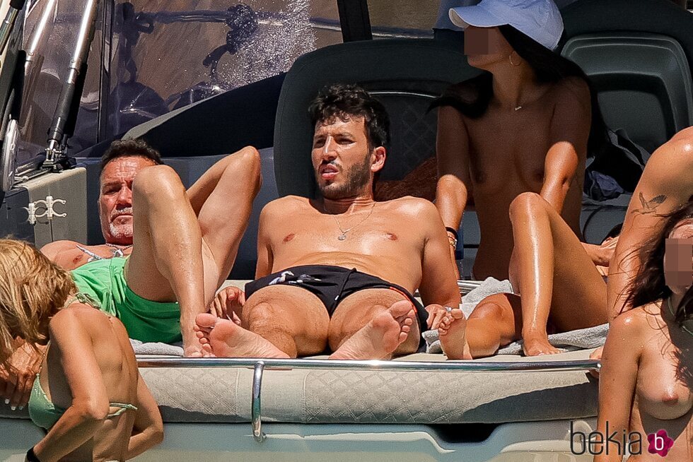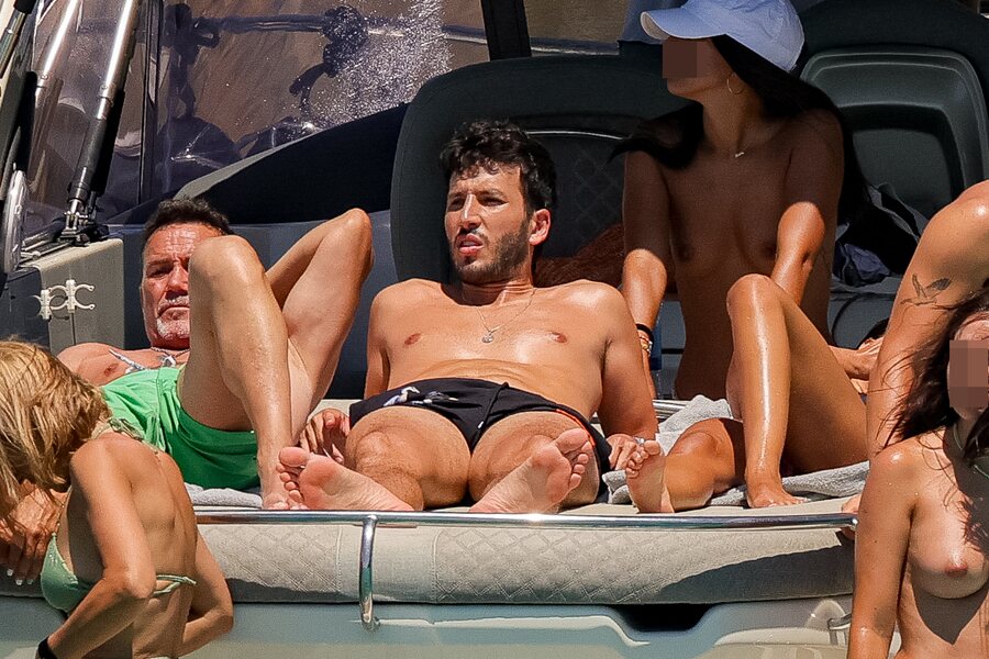 El cantante Sebastián Yatra y Cosme Ocaña, padre de Aitana Ocaña, tomando el sol en un barco durante unas vacaciones en Ibiza.