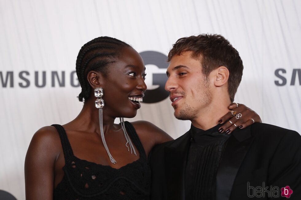 Martiño Rivas y Lily Fofana se miran cómplices y sonrientes durante su posado en los Premios GQ Hombre del Año 2021.