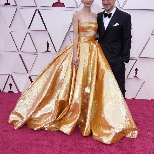 Carey Mulligan y Marcus Mumford son fotografiados posando elegantes en la alfombra roja de los Premios Oscar 2021