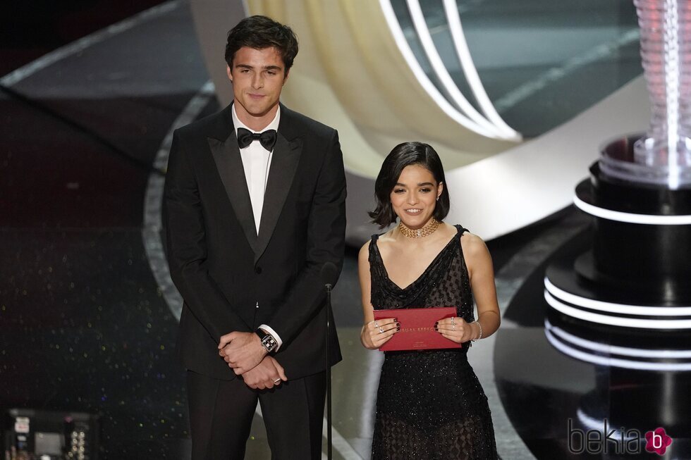 Los actores Jacob Elordi y Rachel Zegler durante la gala de los Premios Oscar 2022 entregando uno de los galardones de la noche.