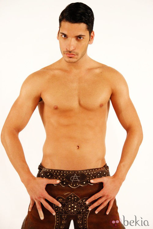 Míster Salamanca 2010 y candidato a Míster España 2011, Manuel Garrido, en la foto ofial del certamen con el torso desnudo enseñando abdominales.