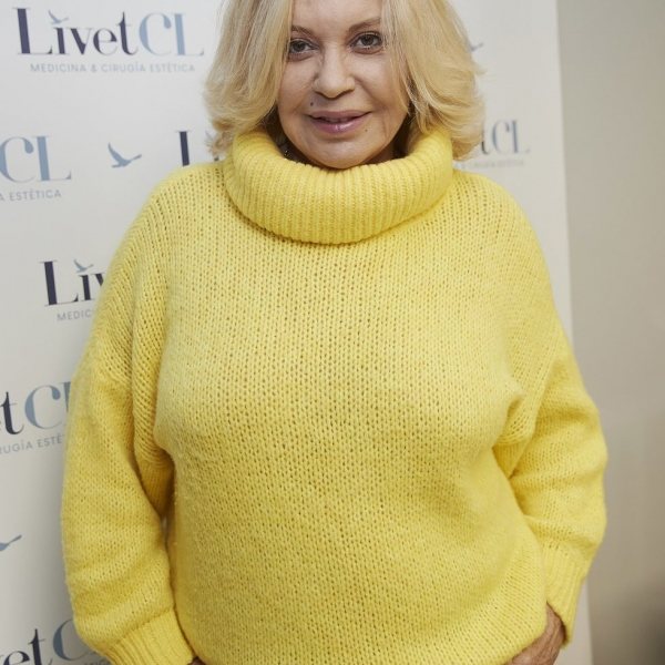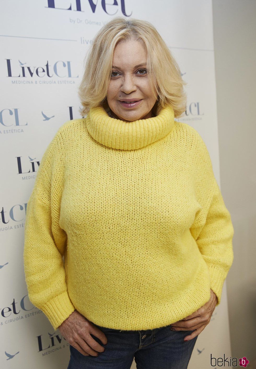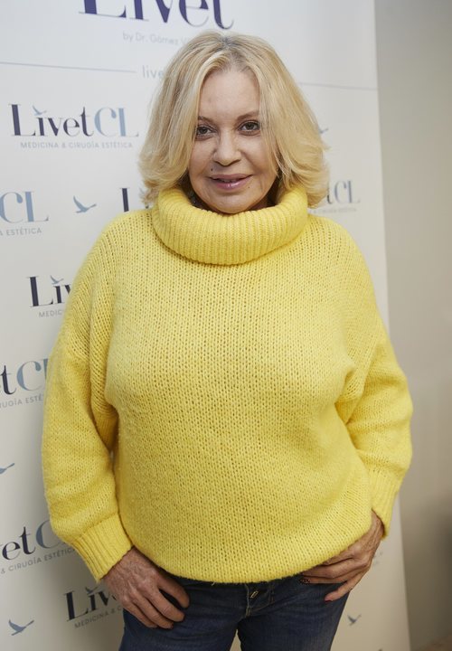 Bárbara Rey es fotografiada posando en el photocall de una presentación de la que fue imagen con un jersey amarillo.