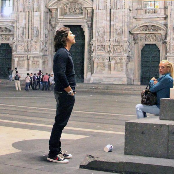 La llamada Princesa del Pueblo Belén Esteban y su representante Toño Sanchís en la Plaza del Duomo de Milán de noche.