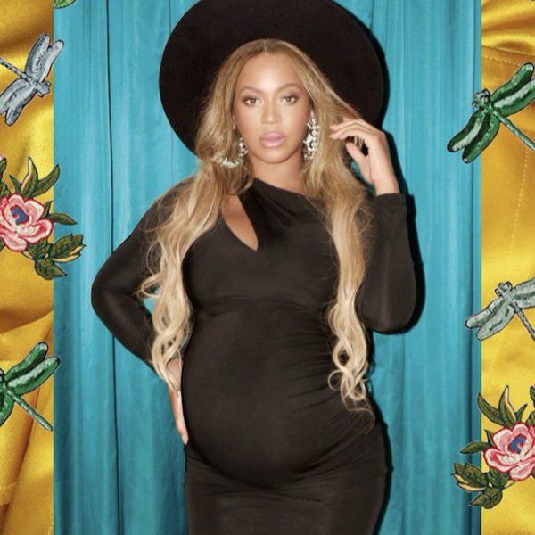 La cantante Beyoncé posa embarazada por segunda vez con un vestido negro y un gran sombrero del mismo color.