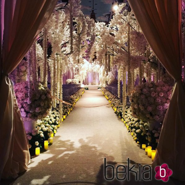 El espectacular pasillo floral compuesto de flores blancas y velas amarillas de la boda de Sofía Vergara y Joe Manganiello.
