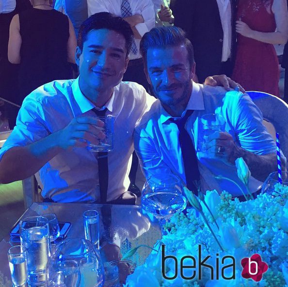 El presentador Mario Lopez brindando con el exfutbolista David Beckham en la boda de Eva Longoria y José Baston