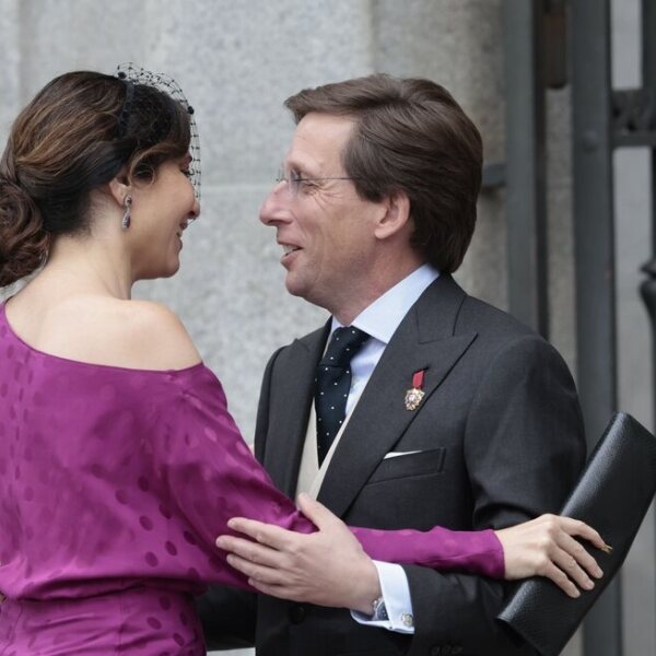 Isabel Diaz Ayuso saludando a José Luis Martínez-Almeida a su llegada a a la Iglesia de San Francisco de Borja de Madrid para la boda con Teresa Urquijo.