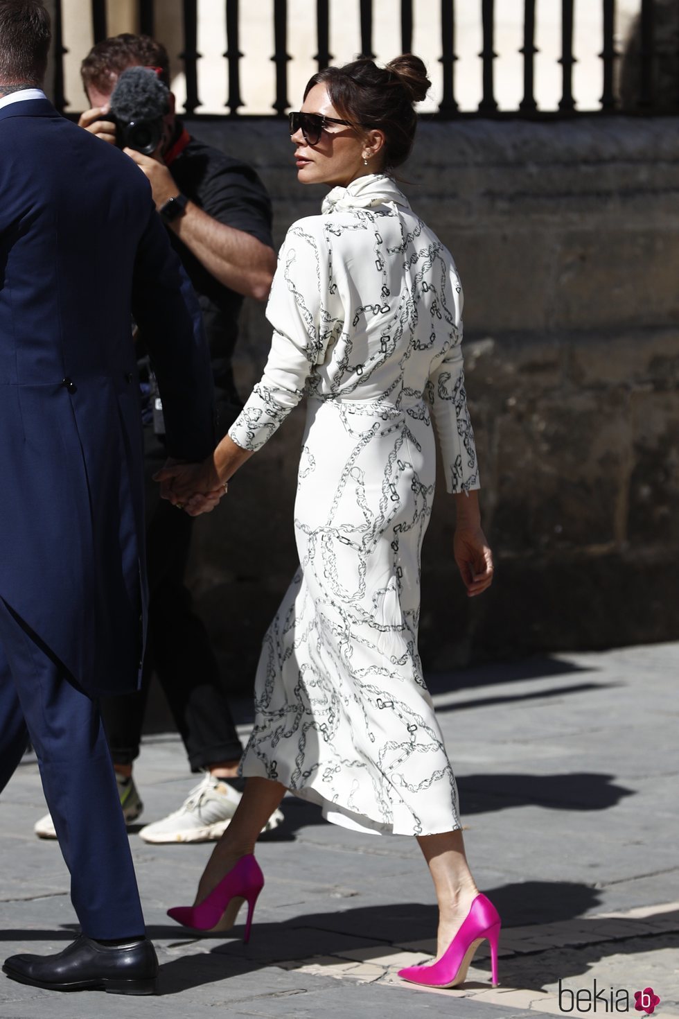 La diseñadora Victoria Beckham llegando a la Catedral de Sevilla para asistir junto a su marido a la boda de Sergio Ramos y Pilar Rubio.