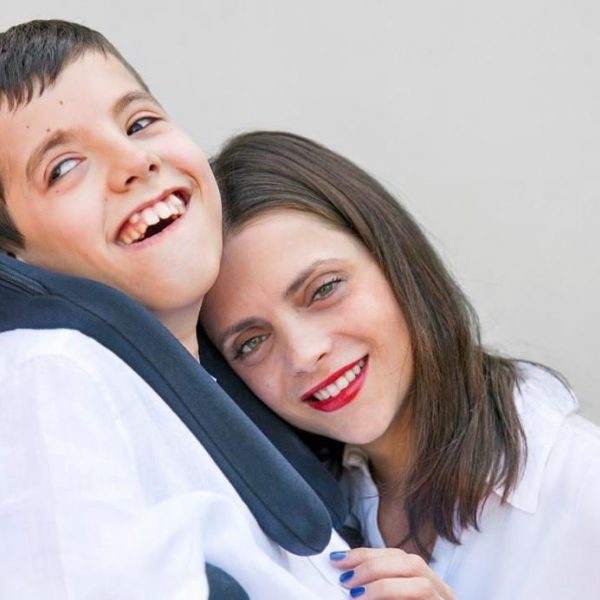 La intérprete Macarena Gómez posa junto a un niño con discapacidad para el calendario del Hospital San Rafael 2016.
