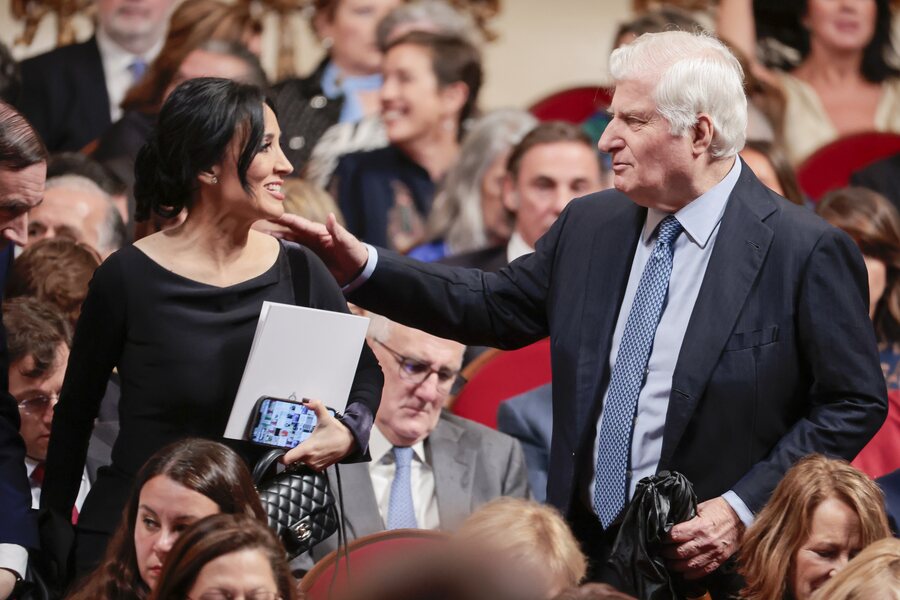 Carlos Fitz-James saluda a Cruz Sánchez de Lara en la ceremonia de entrega de los Premios Princesa de Asturias 2023 en el Teatro Campoamor de Oviedo.