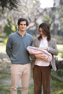La Duquesa de Huéscar mirando a su hija recién nacida Sofía Fitz-James Stuart en su presentación junto al Duque de Huéscar.