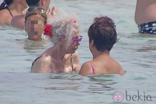La Duquesa de Alba se da un chapuzón con su asistente personal en una playa de Ibiza.