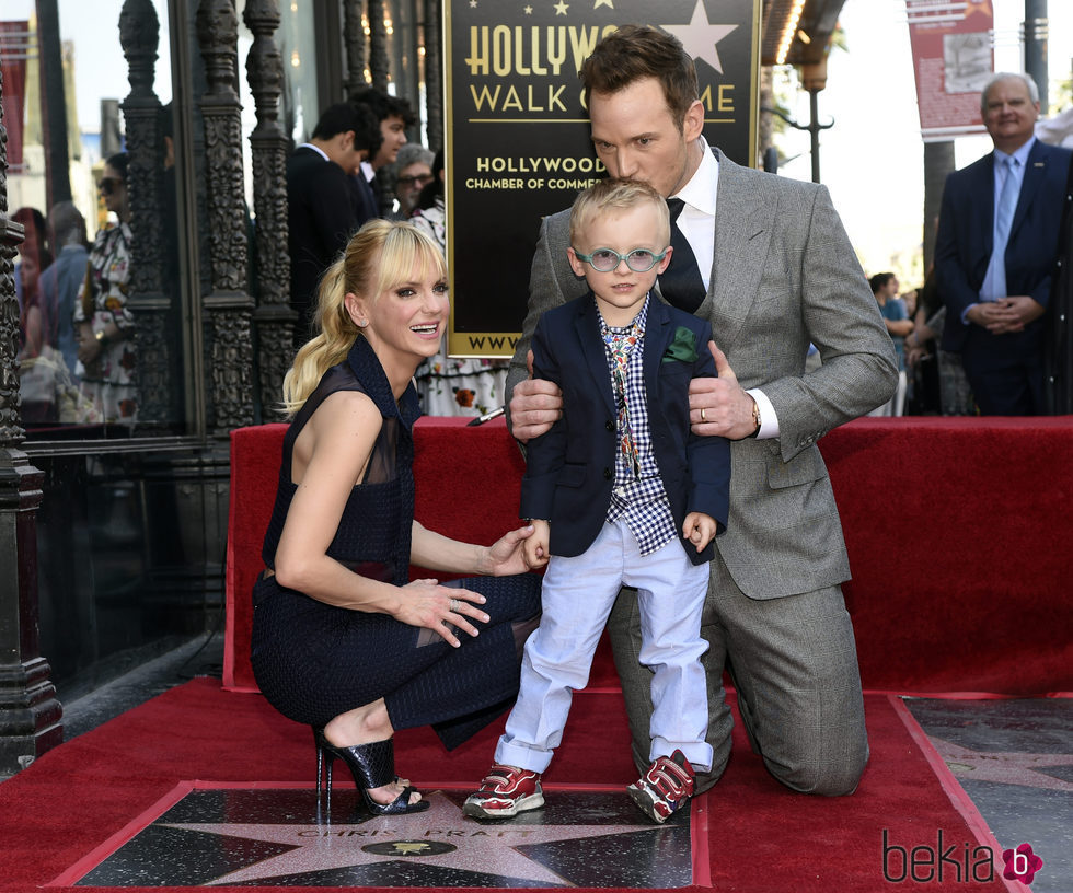 El actor Chris Pratt recibe su estrella en el Paseo de la Fama de Hollywood acompañado por su mujer, la tambien actriz Anna Faris, y su hijo Jack.