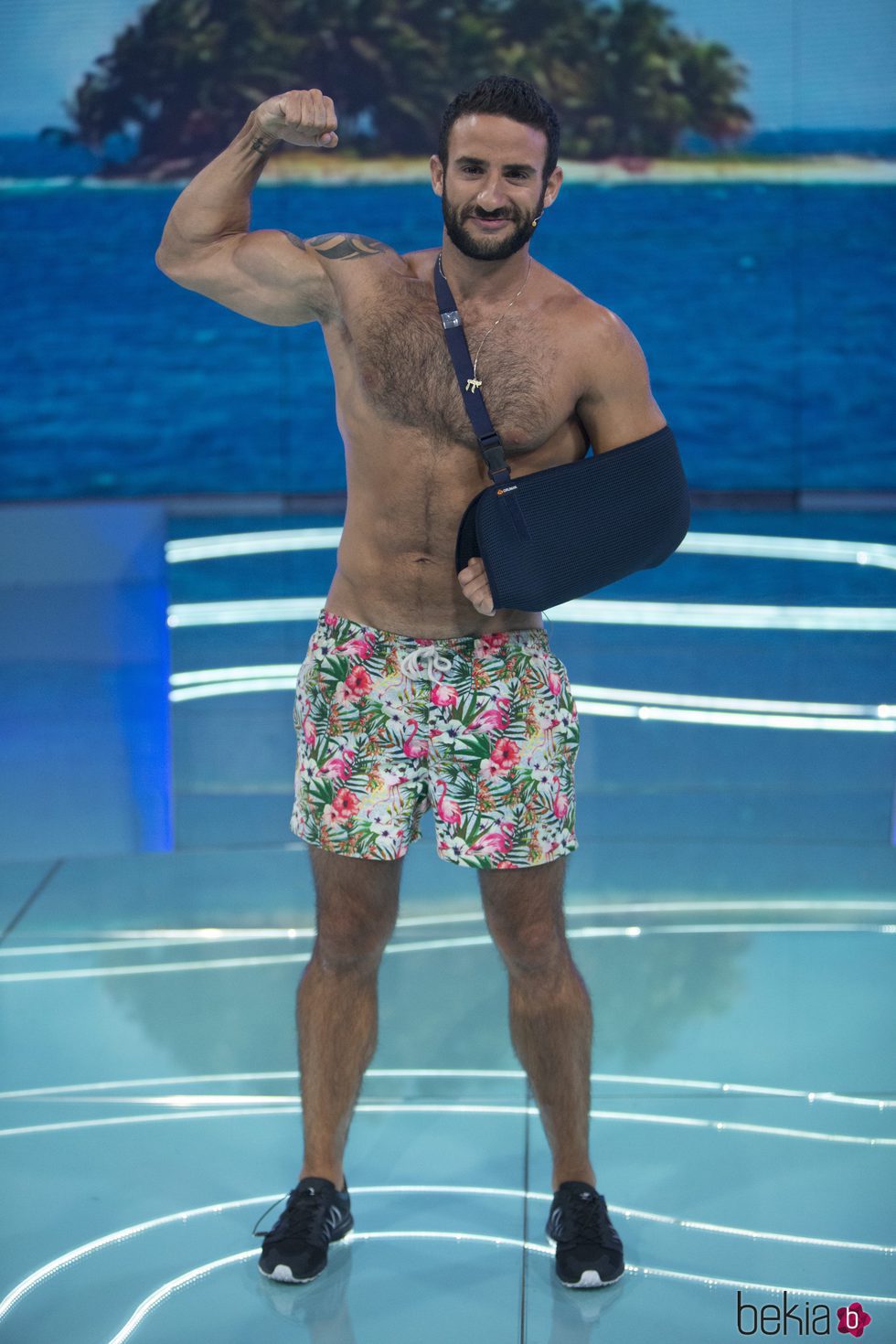 El israelí Eliad Cohen haciendo el símbolo de que está fuerte a pesar de su lesión en el plató de 'Supervivientes 2017' a su vuelta a España
