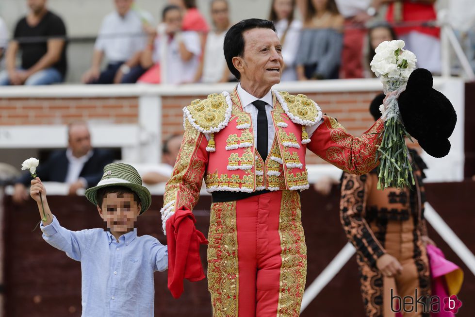 El diestro José Ortega Cano dando la vuelta al ruedo con su hijo José María en su corrida de toros de despedida en San Sebastián de los Reyes