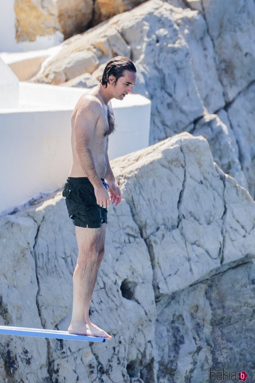 El productor Dimitri Rassam con el torso desnudo en bañador antes de tirarse al agua en Antibes, en la Costa Azul francesa.