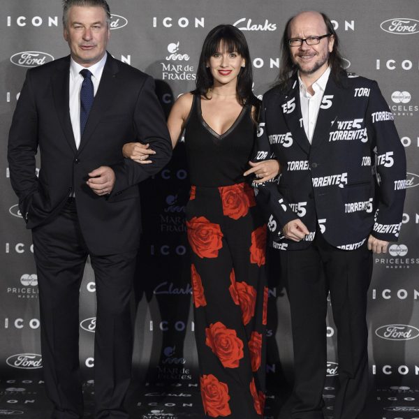 El actor Alec Baldwin con su mujer Hilaria Thomas y el director Santiago Segura en los Premios Icon 2014