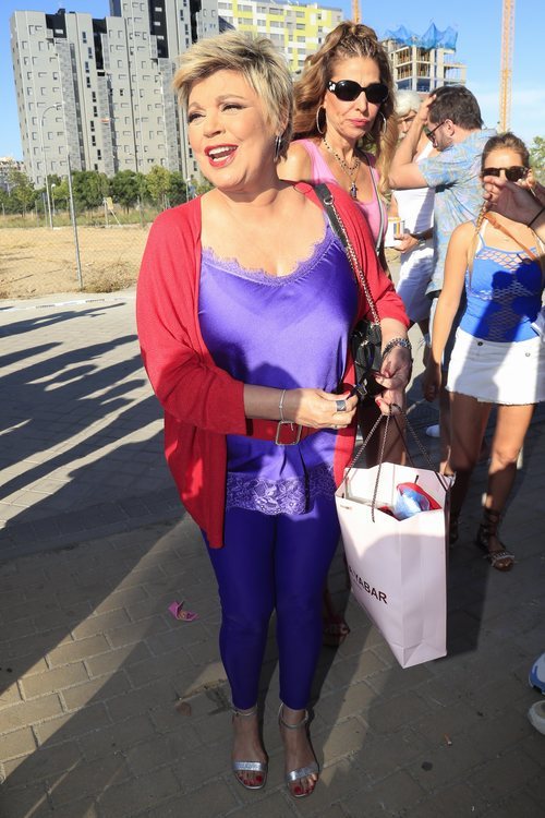 La colaboradora de televisión Terelu Campos llegando a la carroza de la Cabalgata desde la que disfrutó del Orgullo 2019.