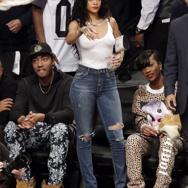 La cantante Rihanna en un partido de la NBA sin sujetador y con unos jeans desgastados