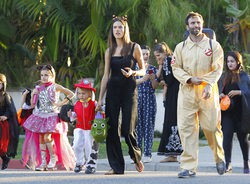 La modelo Alessandra Ambrosio, su marido Jamie Mazur y sus hijos Anja y Noah llegando a una fiesta de Halloween 2015.