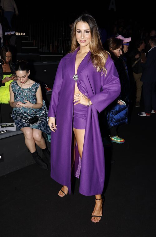 Cristina Porta es fotografiada posando con un conjunto morado como invitada en el front row de la MBFWMadrid 2023.