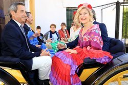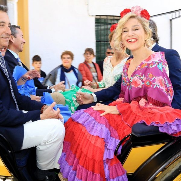 La aristócrata Eugenia Martínez de Irujo acude muy sonriente a la Feria de Abril 2018 subida en una calesa con amigos.