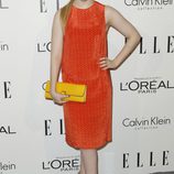 Elizabeth Olsen posa para los medios en la alfombra roja de la fiesta 'Women in Hollywood' de ELLE con vestido de Calvin Klein.
