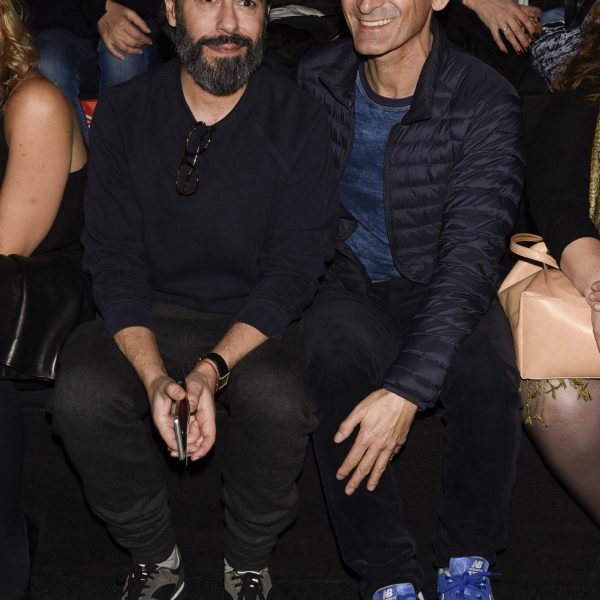 Los diseñadores Juanjo Oliva y Modesto Lomba posan en el front row del desfile de la firma Juana Martín en la Madrid Fashion Week 2017/2018.
