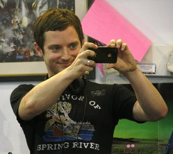 El actor Elijah Wood toma sonriente una foto con su teléfono móvil iPhone de Apple.