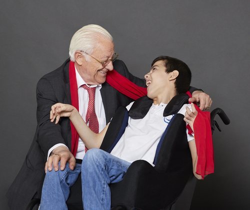 El Padre Ángel posa divertido con un niño con discapacidad para el Calendario Solidario Hospital San Rafael 2019.