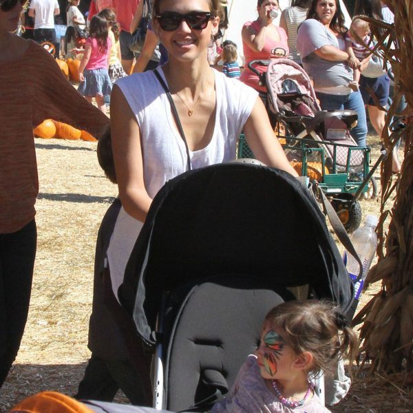 Jessica Alba paseando a su hijo tras una jornada intensa recogiendo calabazas para 'Halloween'