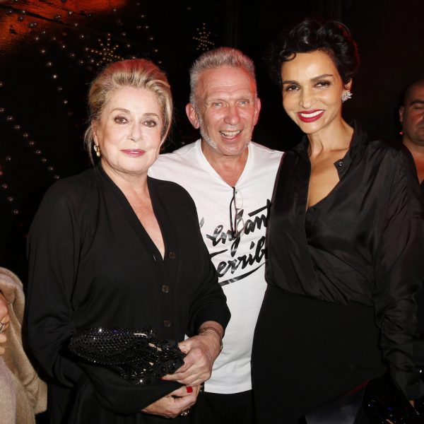La actriz Catherine Deneuve, el diseñador Jean Paul Gaultier y la modelo Nabilla Benattia en el desfile de Jean Paul Gaultier en la Semana de la Moda de París primavera/verano 2014.