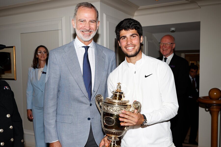 El Rey Felipe VI y el tenista Carlos Alcaraz con el trofeo que le acredita como ganador del torneo de tenis de Wimbledon 2023.