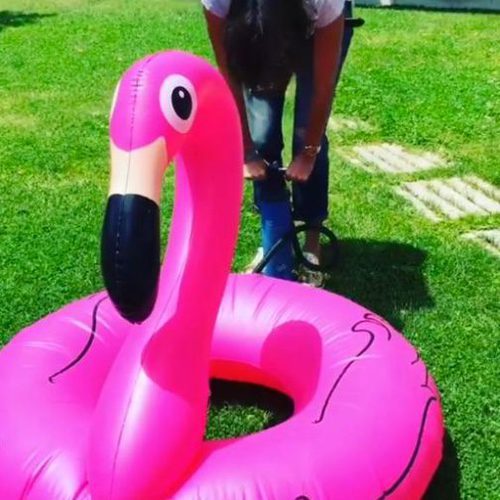 Paz Padilla hinchando divertida el famoso flamenco rosa, la nueva sensación entre todos los famosos y celebrities este verano.