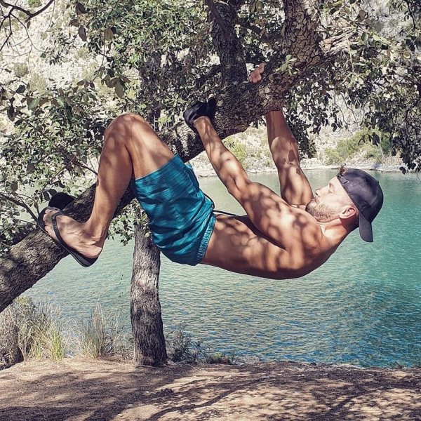 Pablo Alborán es fotografiado subiéndose a un árbol en bañador y con gorra, utilizando guantes para no hacerse daño.