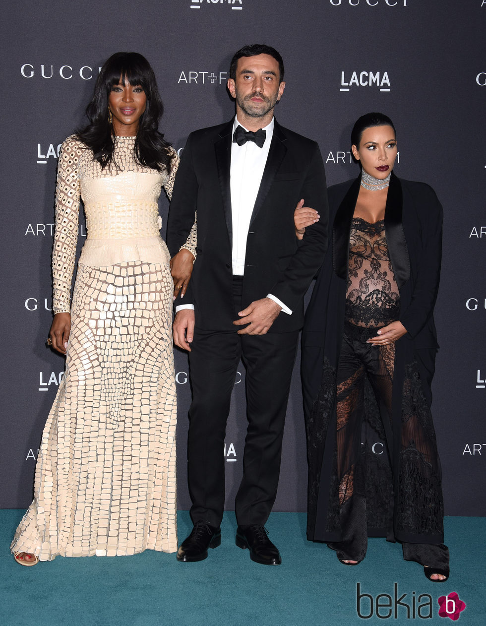 El diseñador Riccardo Tisci posa junto a Naomi Campbell y Kim Kardashian en la Gala LACMA 2015.