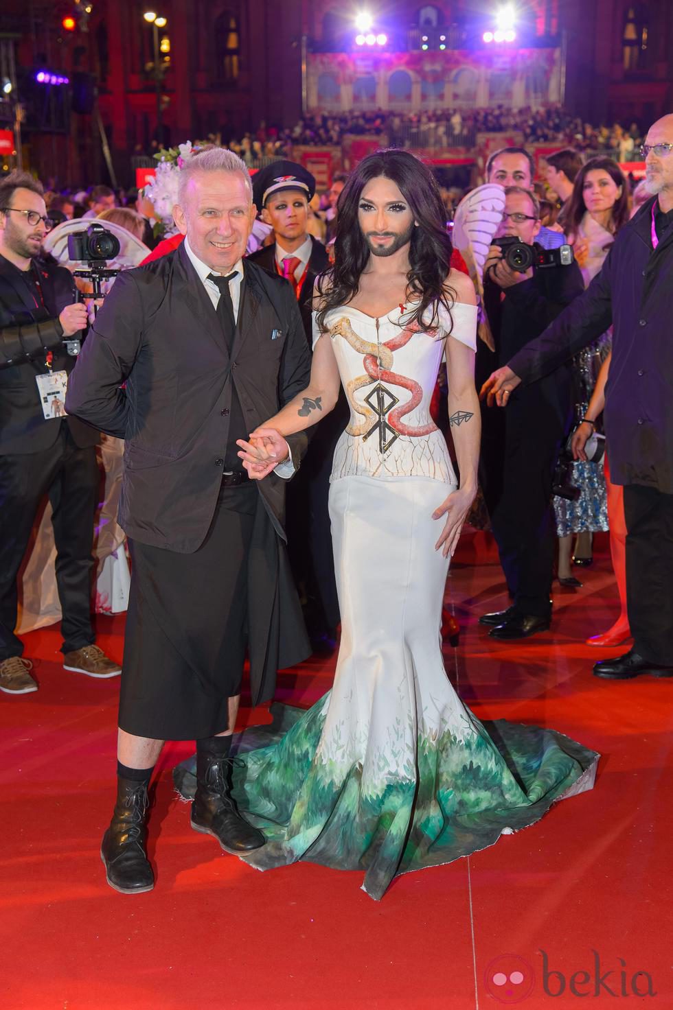La cantante Conchita Wurst y el diseñador Jean Paul Gaultier en la alfombra roja de la gala Life Ball 2014.