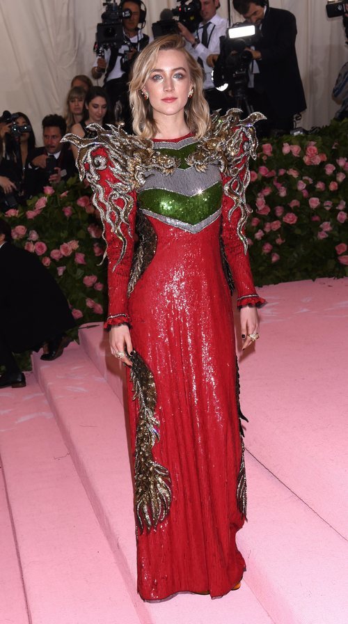 La actriz Saoirse Ronan posando en la alfombra roja de la Gala MET 2019 a su llegada a la gran noche de la moda.