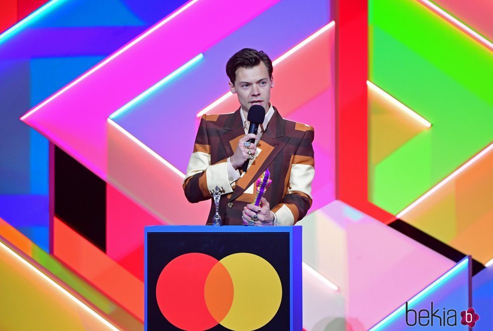 Harry Styles es fotografiado recogiendo su premio a Mejor Single por 'Watermelon Sugar' con un original traje.