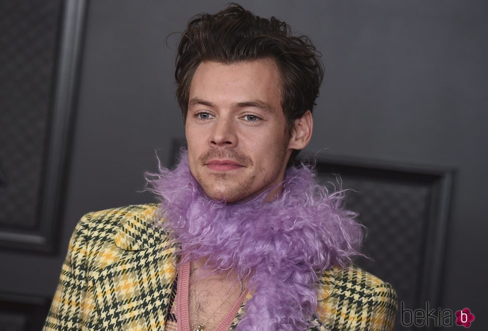 El cantante Harry Styles posando enuna inusual alfombra roja de los Premios Grammy 2021 celebramos el pasado domingo 14 de marzo.