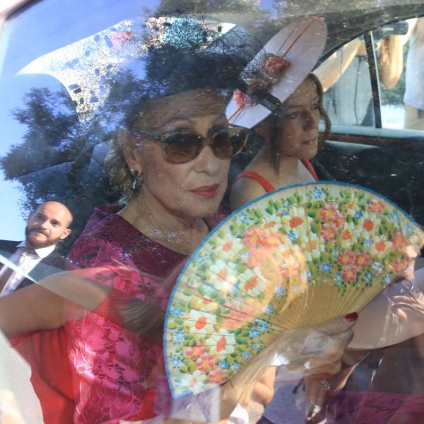 Rosa Benito es fotografiada en el interior del coche llegando al lugar en el que se celebraba la boda de Ortega Cano y Ana María Aldón.