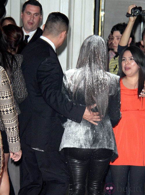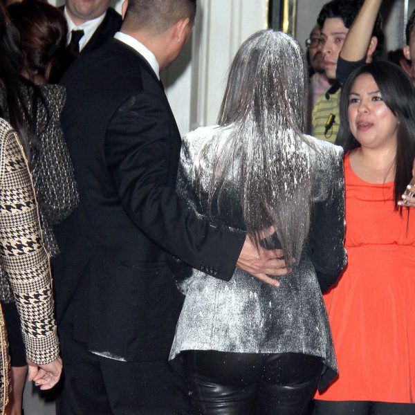 Así quedó Kim Kardashian después de que una mujer lanzara una bolsa de harina sobre la celebrity.