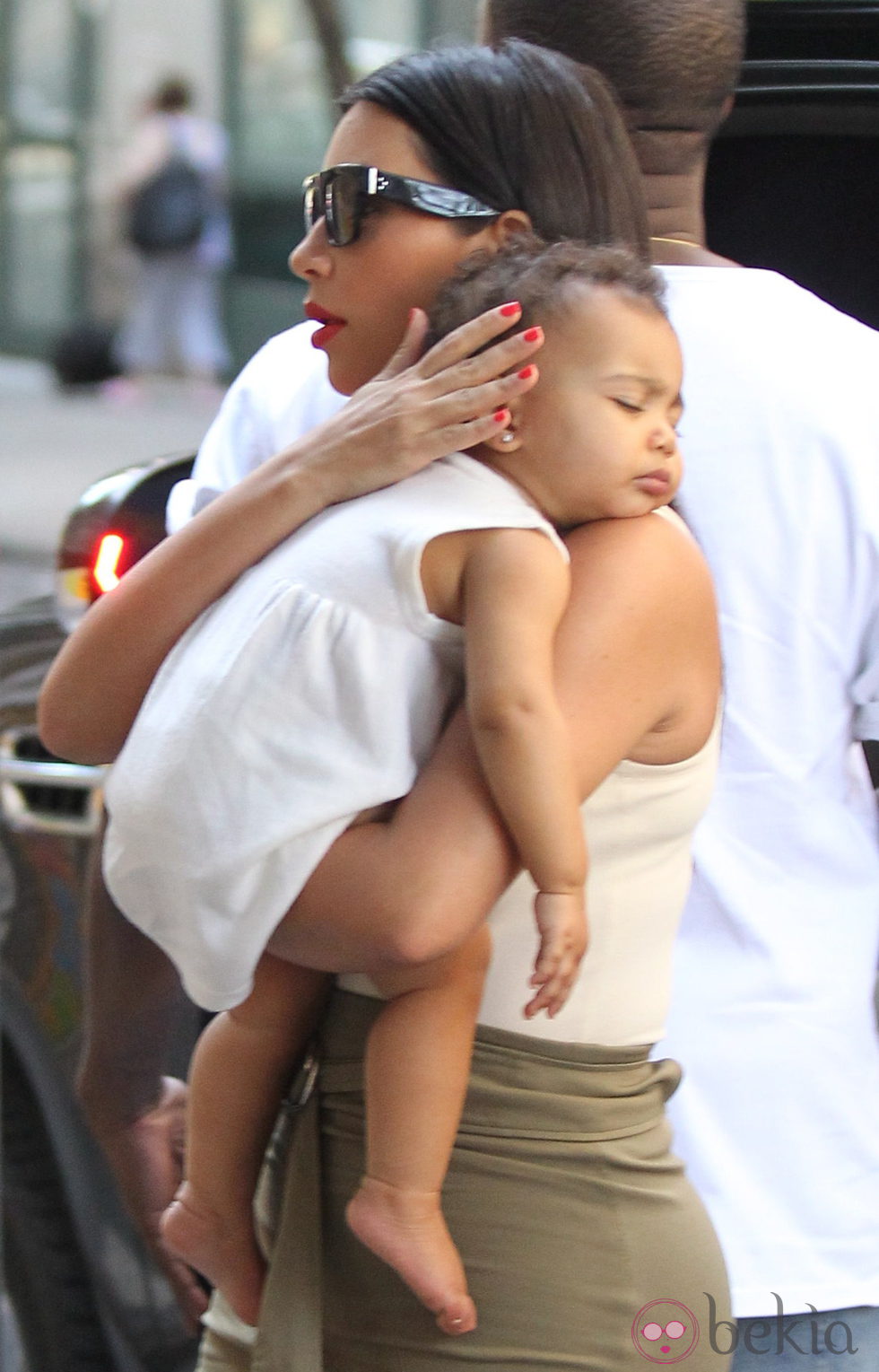Kim Kardashian mece a su hija North West, que se queda dormidita en su hombro mientras acuden a un museo de Manhattan.
