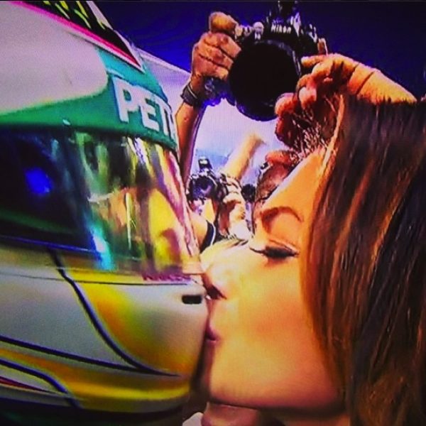 La cantante Nicole Scherzinger besando el caso del piloto Lewis Hamilton tras el GP de Abu Dhabi 2014